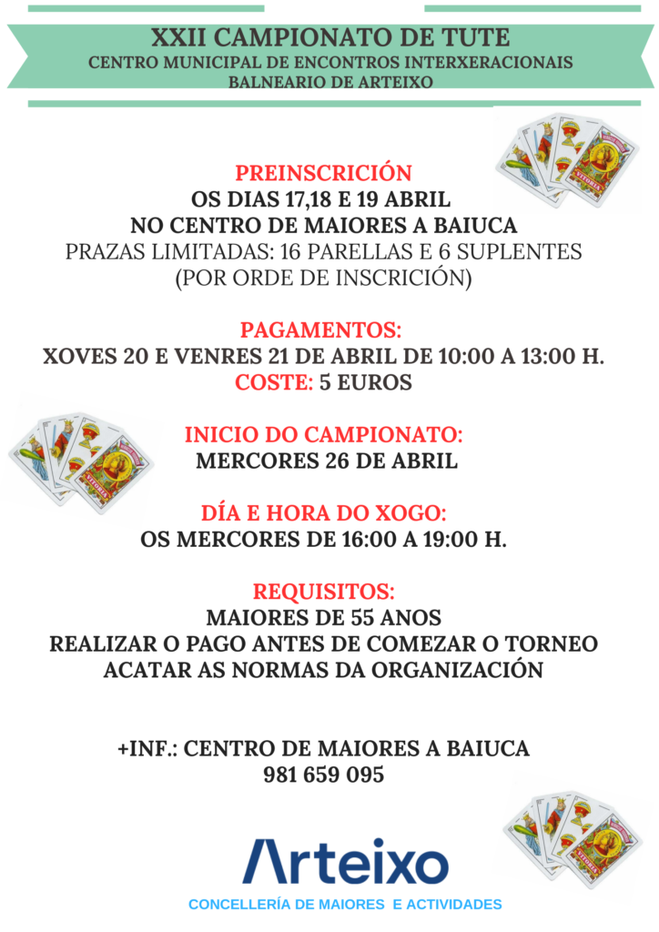 Volve o Campionato de Tute da concellería de maiores En Meicende alcanza a VII Edición mentres que en A Baiuca será a XXII Edición Hai que apuntarse os días 17, 18 e 19 de abril nos centros sociais de A Baiuca ou Meicende, según o caso, e a inscrición costa 5...