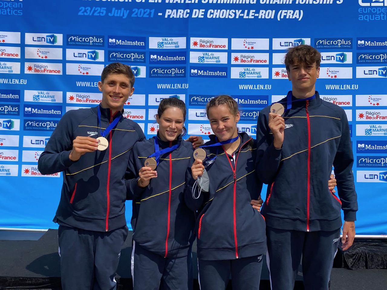 Hoxe domingo pola mañán celebrouse a remuda de 5K mixta, dous nadadores e dúas nadadoras en tramos 1250 metros. España arriesgou coa táctica de tirar de primeiras ás nenas, con Paula á cabeza, que deixou a remuda en moi bo posto, para que a súa compañeira e os nenos remataran a faena con grandes resultados para o equipo, Bronce europeo, a moi poucas décimas do segundo clasificado.